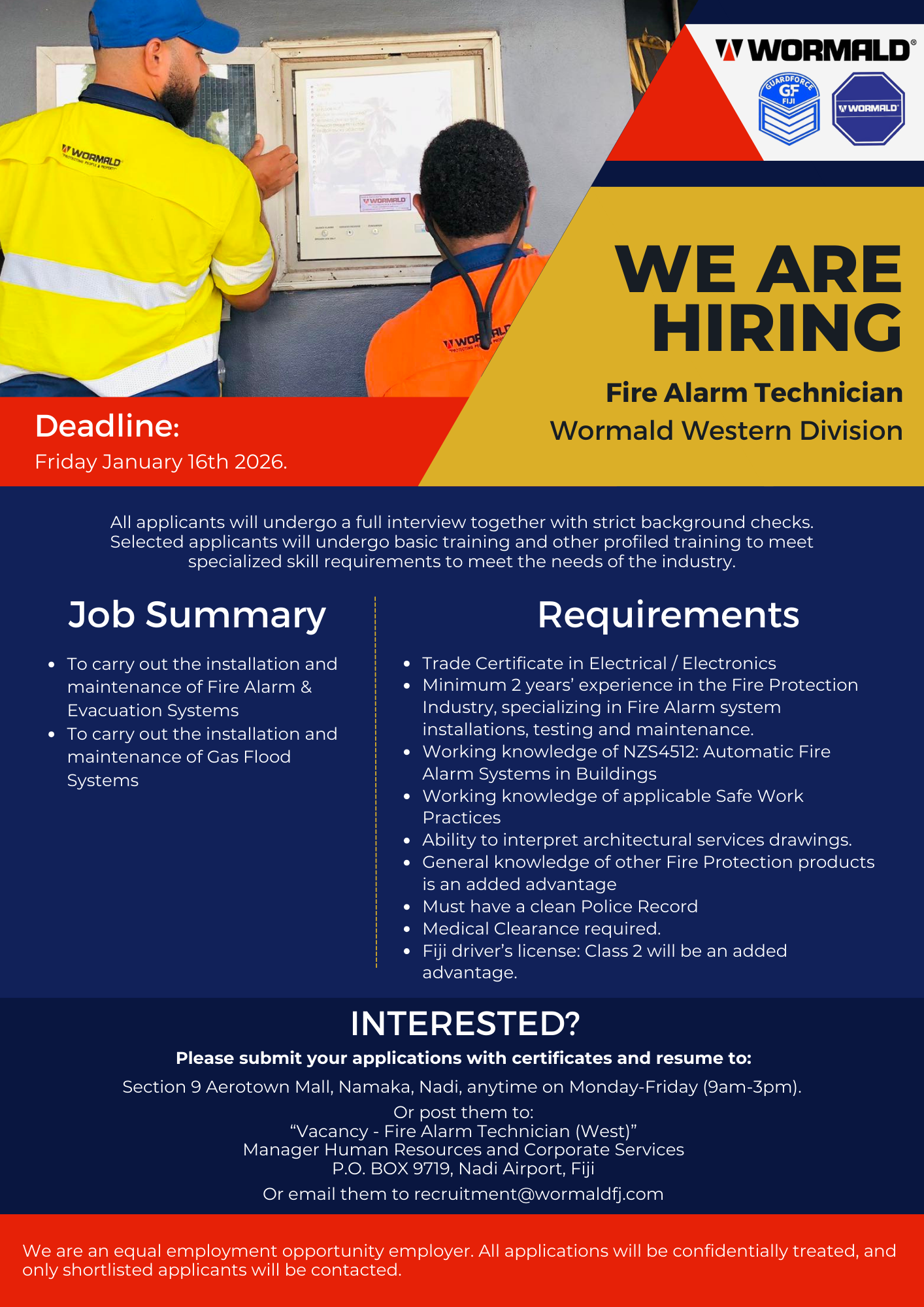 Vacancy position: Fire Alarm Technician Site: Wormald Western Division Due date: 4pm Friday January 16th 2025 Please submit your applications with certificates and resume to:Section 9 Aerotown Mall, Namaka, Nadi, anytime on Monday-Friday (9am-3pm). Or post them to:“Vacancy – Fire Alarm Technician (West)”Manager Human Resources and Corporate ServicesP.O. BOX 9719Nadi Airport, Fiji Or email them to recruitment@wormaldfj.com