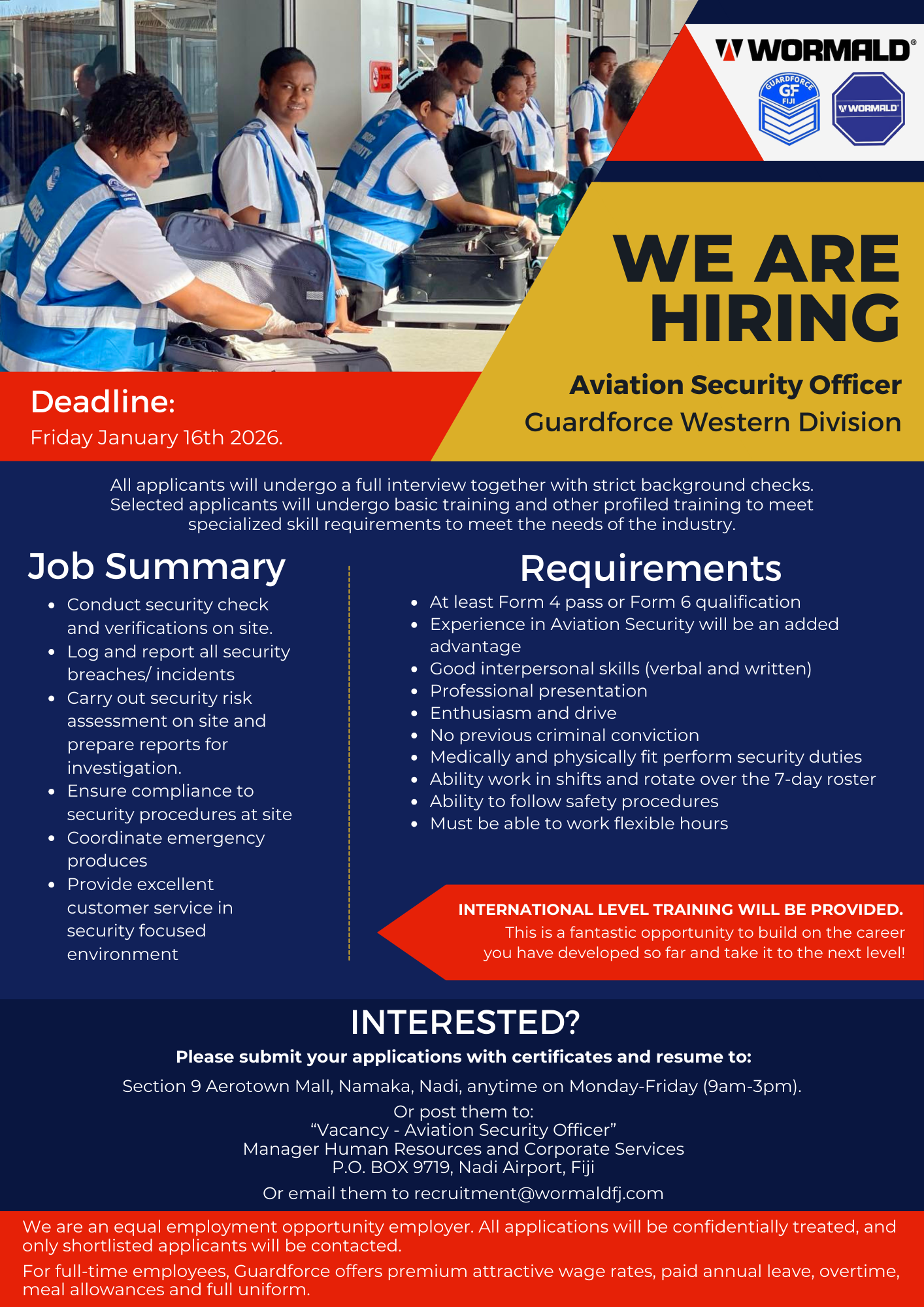 Vacancy position: Security Officer Site: Wormald Western Division Due date: 4pm Friday January 16th 2025 Please submit your applications with certificates and resume to:9 Raiwasa Road Samabula, anytime on Monday-Friday (9am-3pm). Or post them to:“Vacancy – Aviation Security Officers (West)”Manager Human Resources and Corporate ServicesP.O. BOX 9719Nadi Airport, Fiji Or email them to recruitment@wormaldfj.com