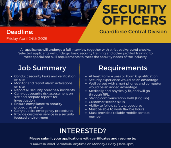 Vacancy position: Security Officer Site: Wormald Central Division Due date: 4pm Friday April 24th 2026 Please submit your applications with certificates and resume to:9 Raiwasa Road Samabula, anytime on Monday-Friday (9am-3pm). Or post them to:“Vacancy – Security Officers (Central)”Manager Human Resources and Corporate ServicesP.O. BOX 1319Suva Or email them to recruitment@wormaldfj.com