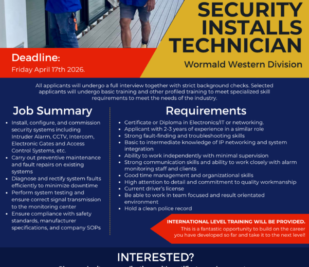 Vacancy position: Security Installs Technician Site: Wormald Western Division Due date: 4pm Friday April 17th 2026 Please submit your applications with certificates and resume to:Section 9 Aerotown Mall, Namaka, Nadi, anytime on Monday-Friday (9am-3pm). Or post them to:“Vacancy – Security Installs Technician (West)”Manager Human Resources and Corporate ServicesP.O. BOX 9719Nadi Airport, Fiji Or email them to recruitment@wormaldfj.com
