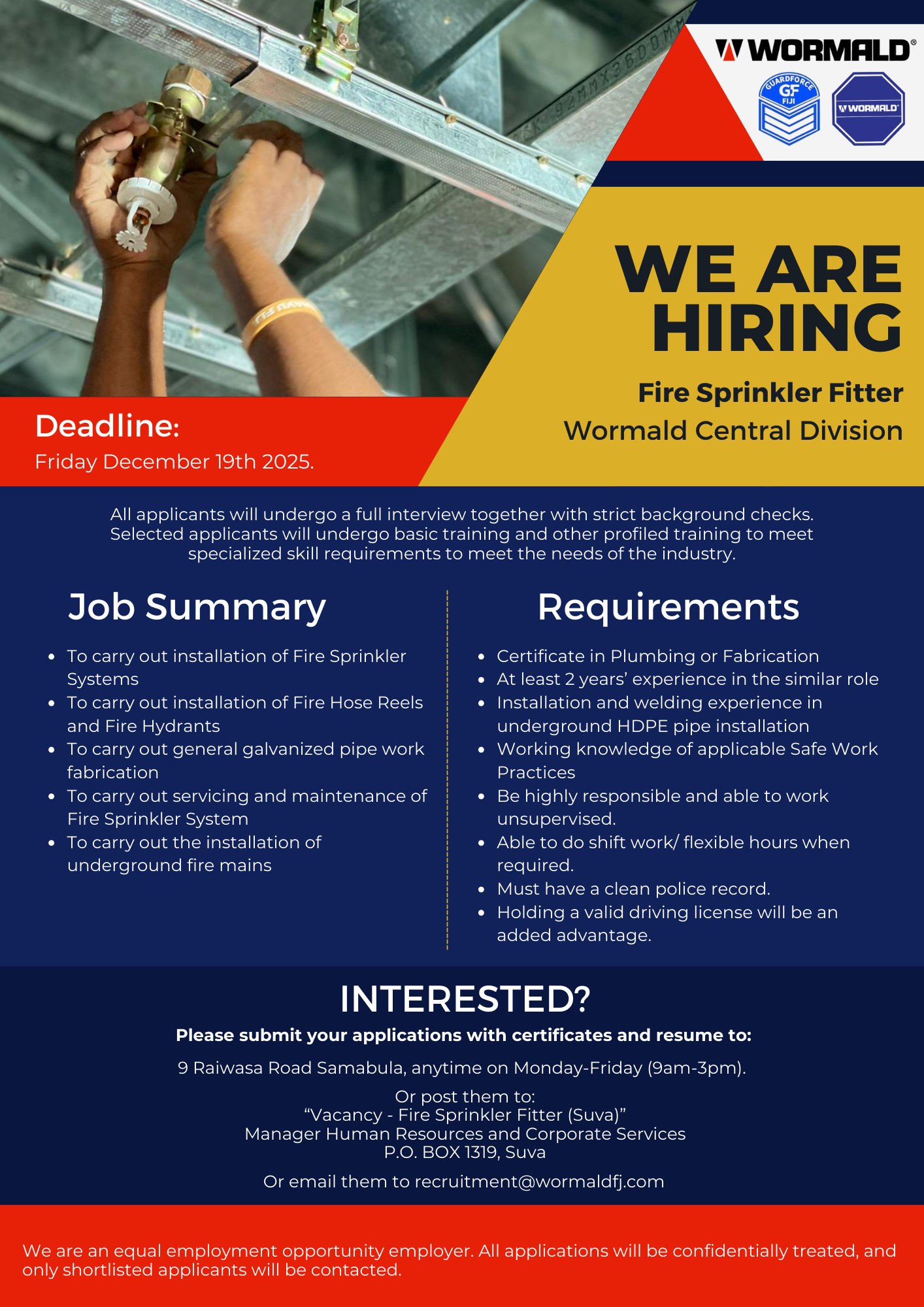 Vacancy position: Fire Sprinkler Fitter Site: Wormald Central Division Due date: 4pm Friday December 19th 2025 Please submit your applications with certificates and resume to:9 Raiwasa Road Samabula, anytime on Monday-Friday (9am-3pm). Or post them to:“Vacancy – Fire Sprinkler Fitter (Suva)”Manager Human Resources and Corporate ServicesP.O. BOX 1319Suva Or email them to recruitment@wormaldfj.com
